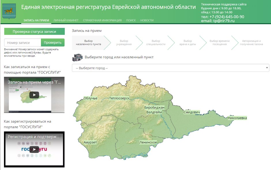 На сегодняшний день в ЕАО запущен и полноценно функционирует сервис «Электронная регистратура», который располагается по адресу http://регистратура79.рф. На данном ресурсе пациенты области могут записаться на прием к медицинскому специалисту.